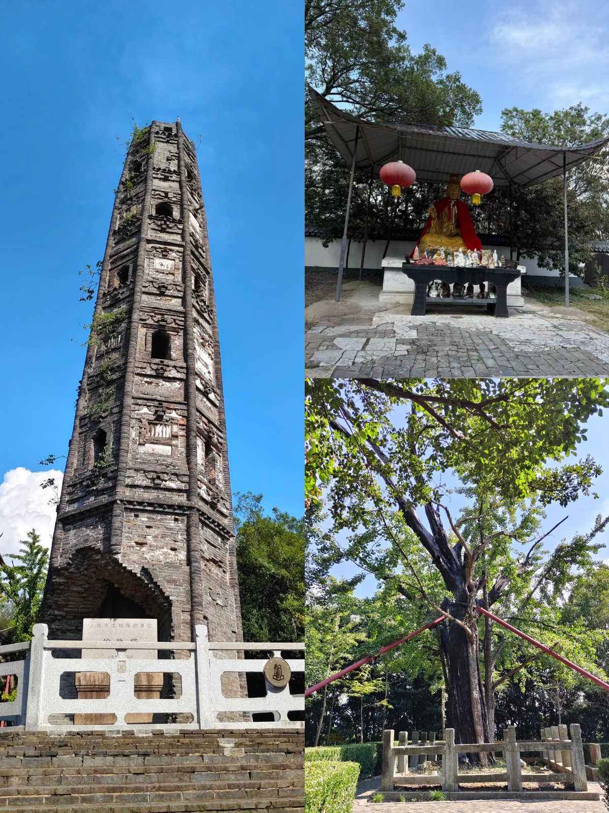 酒足饭饱后,我们迎来了本次团建的重头戏——攀登天马山!作为佘山所在的松江九峰十二山中海拔最高的山峰(约 100.2 米),天马山以 “山形似奔马” 得名,兼具自然野趣与千年人文印记,是上海城郊难得的访古寻幽之地。其最大的看点无疑是护珠宝光塔。这座北宋古塔是世界上斜度最大的佛塔之一,其塔身倾斜度超过比萨斜塔,具有较高的旅游价值,也为研究古松江历史,提供了重要的实物资料。塔旁 700 年树龄的古银杏枝繁叶茂,民间传为 “托塔神树”,与斜塔相映成趣。此外,山上还有上峰寺遗址的铜观音、三高士文化园等历史遗迹。