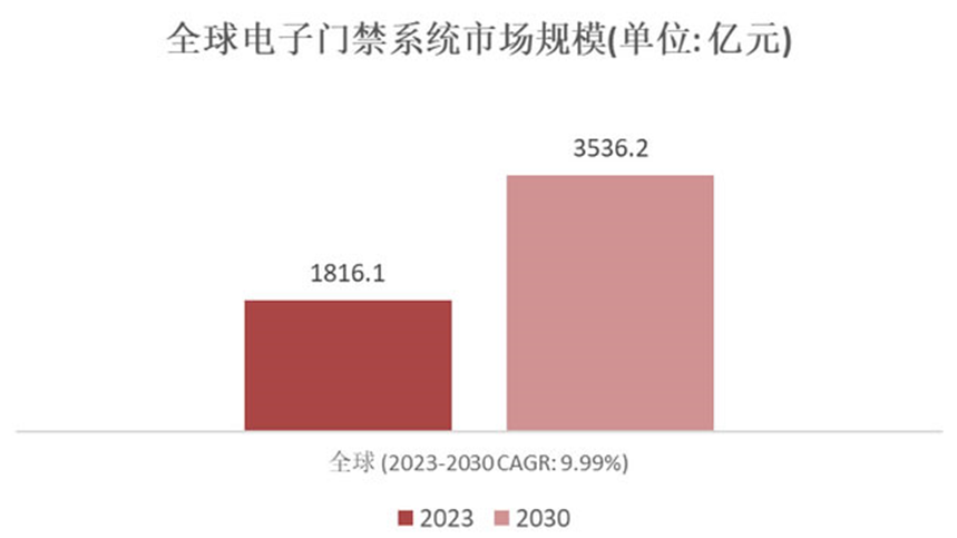 政府部门对门禁系统的需求集中于保密性与合规性,以确保重要区域的安全和信息的保密性。某省级政务中心采用量子加密门禁系统,实现文件流转全程可追溯,有效保障了政务工作的安全性和规范性。全球电子门禁系统市场规模呈现稳步扩张的态势,2023年全球电子门禁系统市场规模为1816.1亿元,预计2030年将达到3536.2亿元,2023-2030期间年复合增长率为9.99%。